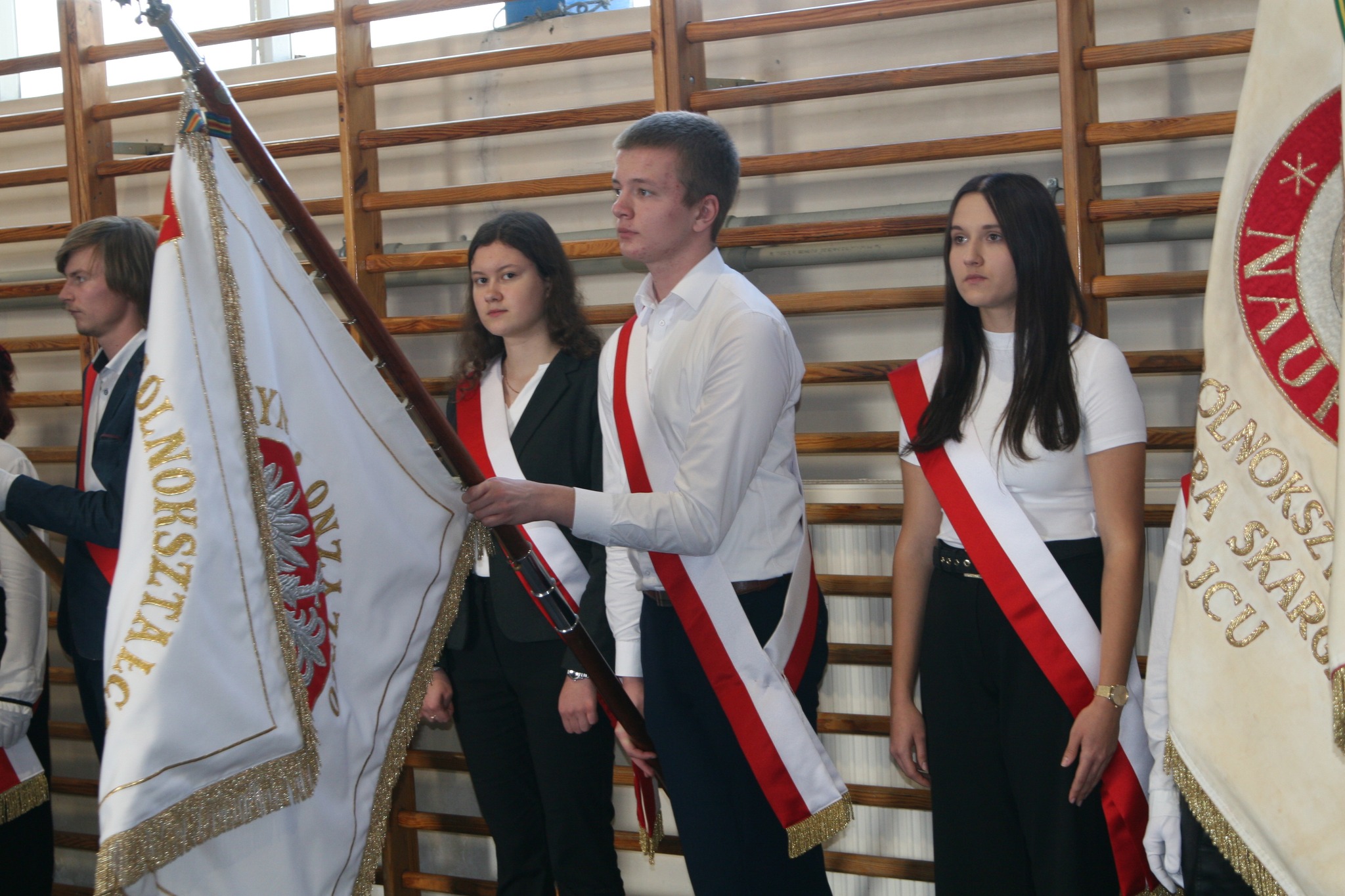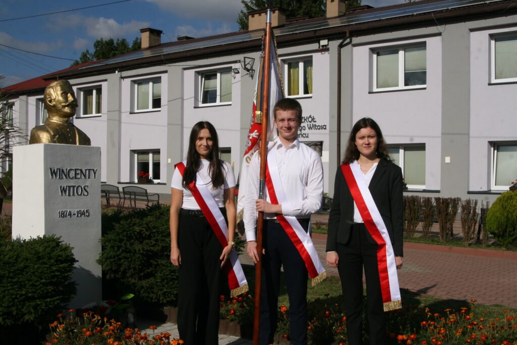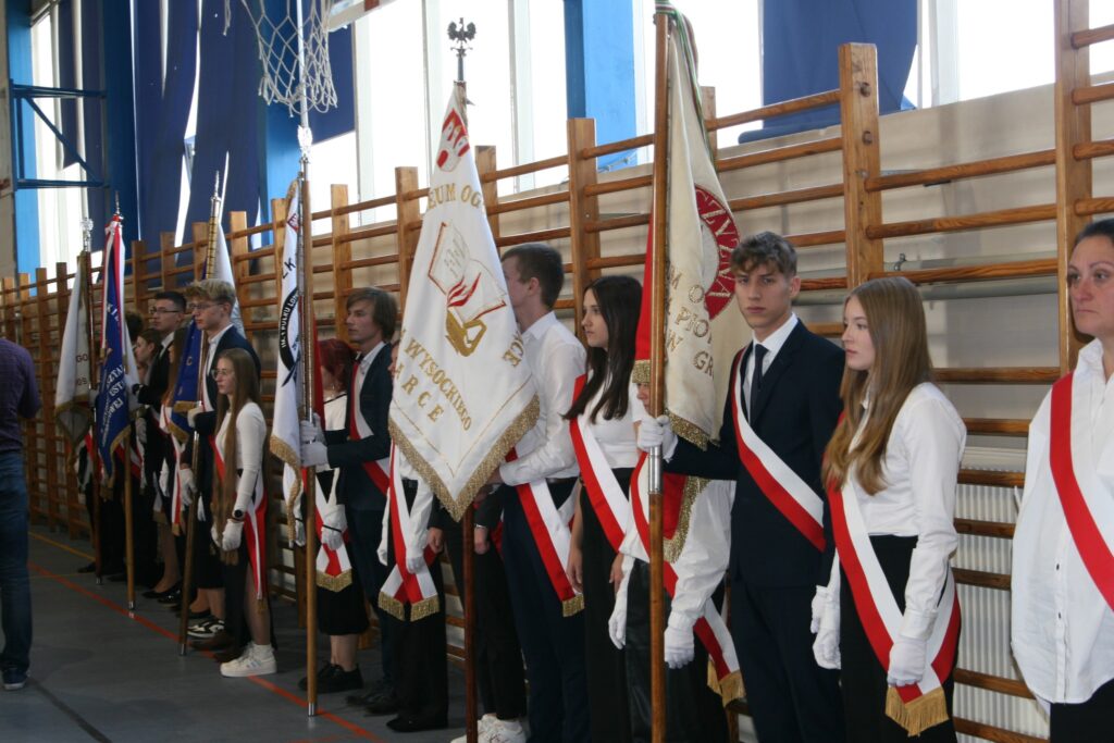 Wydarzenie z udziałem pocztów sztandarowych wszystkich szkół ponadpodstawowych z terenu powiatu rozpoczęło się od powitania zaproszonych gości przez gospodarza szkoły Panią Dyrektor Dorotę Nowak-Michałowską, która podziękowała nauczycielom i pracownikom oświaty za ich trud, poświęcenie i oddanie w kształceniu młodego pokolenia. Następnie głos zabrali Starosta Grójecki Krzysztof Ambroziak oraz Radny Sejmiku Województwa Mazowieckiego Leszek Przybytniak, którzy podkreślili ważność pracy nauczycieli. Starosta Grójecki, w swoim wystąpieniu, przypomniał znaczenie edukacji i rolę pedagogów w kształtowaniu przyszłości naszego społeczeństwa. Podkreślił też wartość inwestycji realizowanych przez powiat w podległych placówkach edukacyjnych – termomodernizację szkoły, budowę boisk oraz remonty sal lekcyjnych.