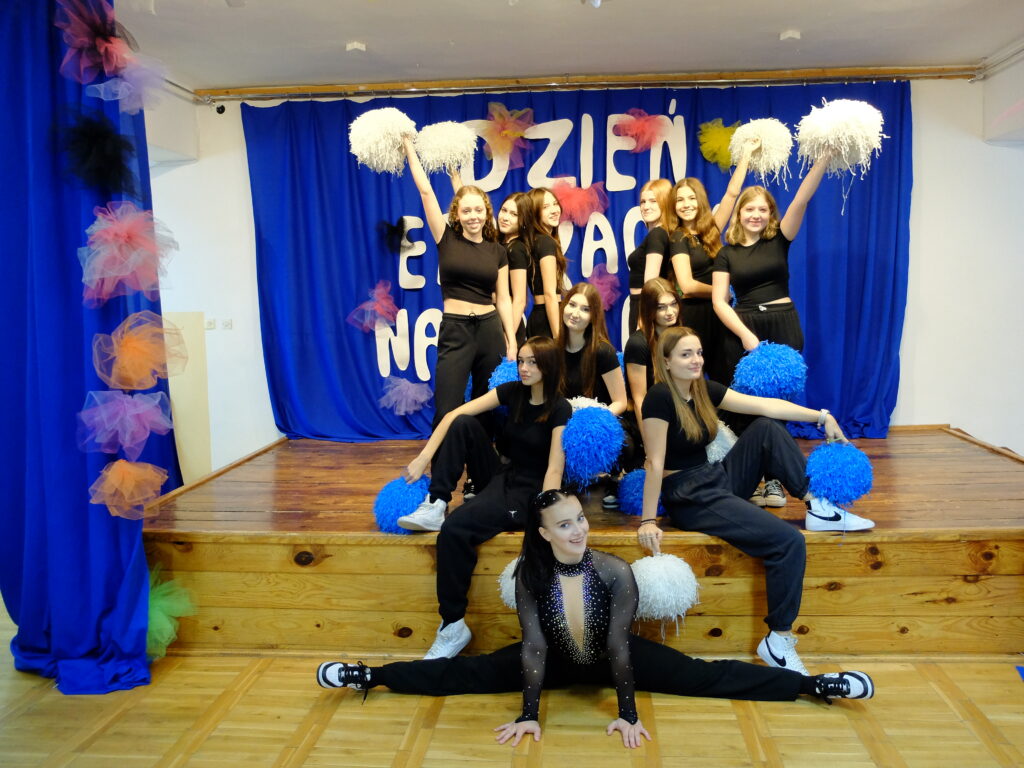 Konferansjerkę prowadził Paweł Szymaniak z klasy IV b, który rozpoczął akademię od życzeń i podziękowań dla całej społeczności szkolnej. Jako pierwsza pojawiła się na scenie uczennica klasy II a Zuzanna Rogala, która wykonała układ taneczno-akrobatyczny do singla z debiutanckiego albumu Jennifer Lopez – „Let’s Get Loud”. 15 minut później Zuzanna dołączyła do grupy szkolnych cheerleaderek, które brawurowo zatańczyły do utworu „On The Floor”. Nasz szkolny zespół taneczny wystąpił w następującym składzie: Dominika Witkowska – I a, Wiktoria Wieczorek, Oliwia Krawczyk – I b, Nikola Szczepaniak, Oliwia Kasprzak – I d, Natalia Krześniak, Oliwia Podymniak – II b, Sandra Kowalska, Sandra Lech, Dominika Kowalska – III a. Oba występy dostarczyły widzom niezapomnianych wrażeń.