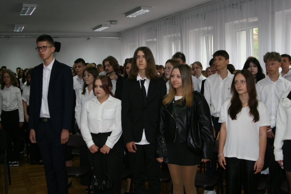 Jak co roku, uroczystość rozpoczęła się najpierw od Mszy św. w kościele św. Mikołaja, a o godz.9:00 wszyscy spotkaliśmy się w auli LO. Cała zgromadzona społeczność odśpiewała hymn państwowy, a potem hymn szkoły. Pani Dyrektor z wielką serdecznością powitała gości, uczniów, a w szczególności tych nowo przybyłych, rodziców, maturzystów, pracowników szkoły. Wyraziła ogromną radość z powodu utworzenia aż pięciu oddziałów klas pierwszych. Jednocześnie przedstawiła uczniom obejmującego stanowisko wicedyrektora szkoły- pana Zbigniewa Stępnia, który ciepło podziękował za tę nobilitację i zaufanie.