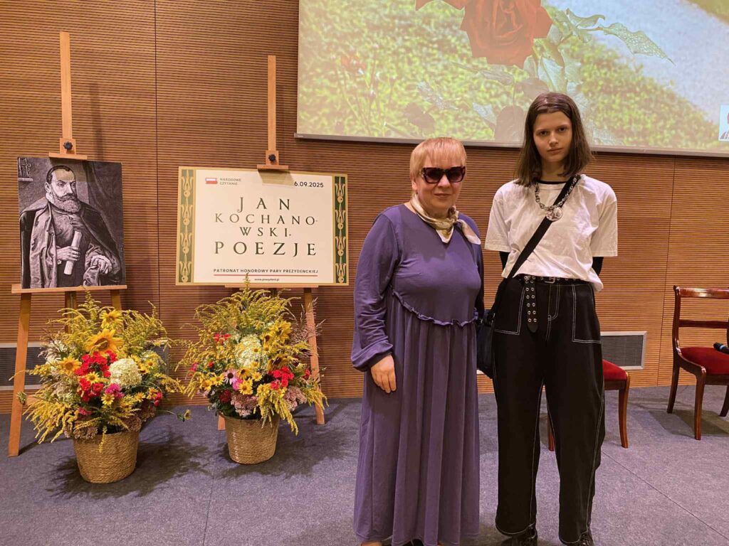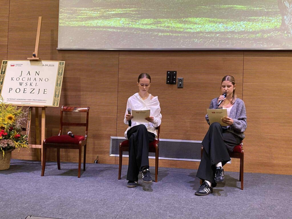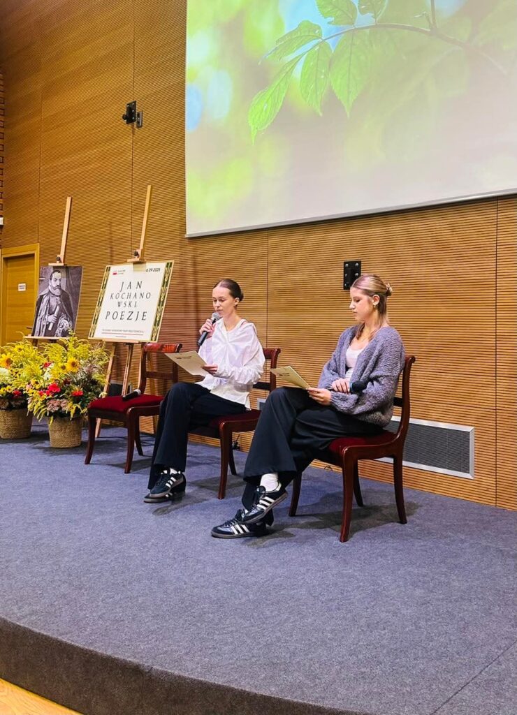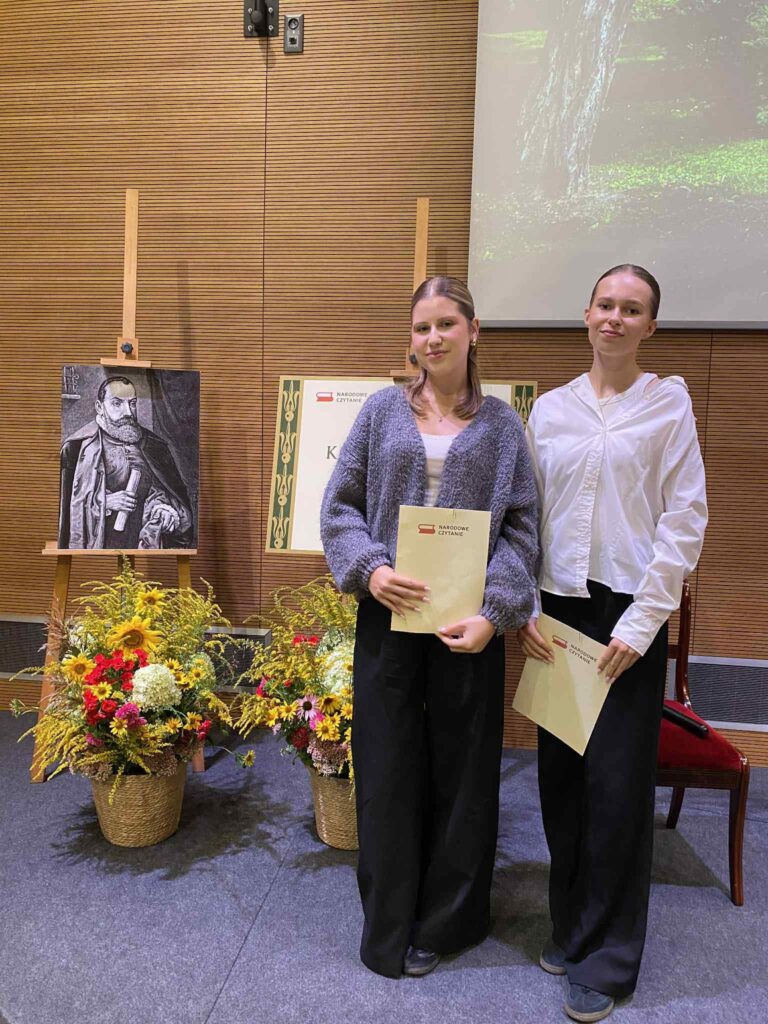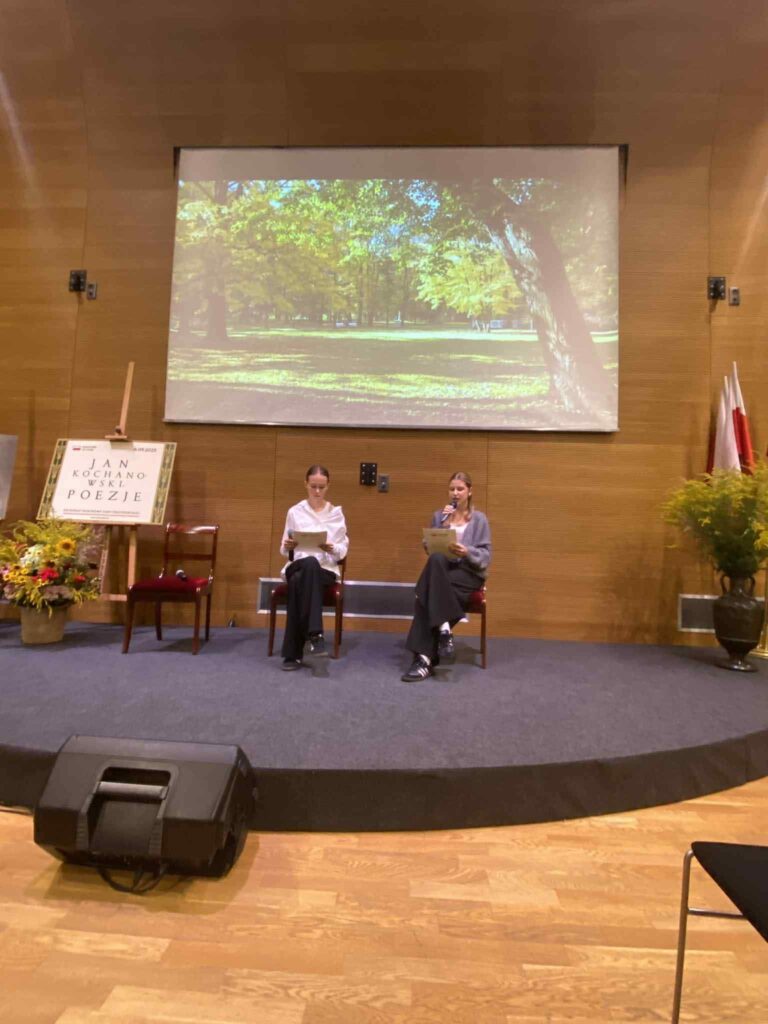 Naszą szkołę reprezentowała dość liczna grupa uczniów z klas pierwszych i trzecich, co ucieszyło niepomiernie towarzyszące im panie „od polskiego”- Mariolę Rękawik i Agnieszkę Rudnicką. Grono naszych nauczycieli wzmocniły również – Pani Dorota Kreczmańska, Pani Bożena Kozłowska i Pan Zbigniew Stępień (tu reprezentował Radę Gminy Warka i konkursowo wygłosił, z Panem Danielem Bugałą, absolwentem naszego Liceum, fraszkę „O żywocie ludzkim”). Na scenie wystąpiły dziewczęta z klasy III A, Julia Skrzypkowska i Kinga Woźniak. Julka i Kinga zaprezentowały „Tren I”. Ze sceny wybrzmiało wiele utworów poetyckich, ze zbioru „Fraszek”, „Pieśni” i „Trenów”- od hymnu „Czego chcesz od nas, Panie…” do „Pieśni IX, Księgi wtóre”: „ Nie porzucaj nadzieje…”.