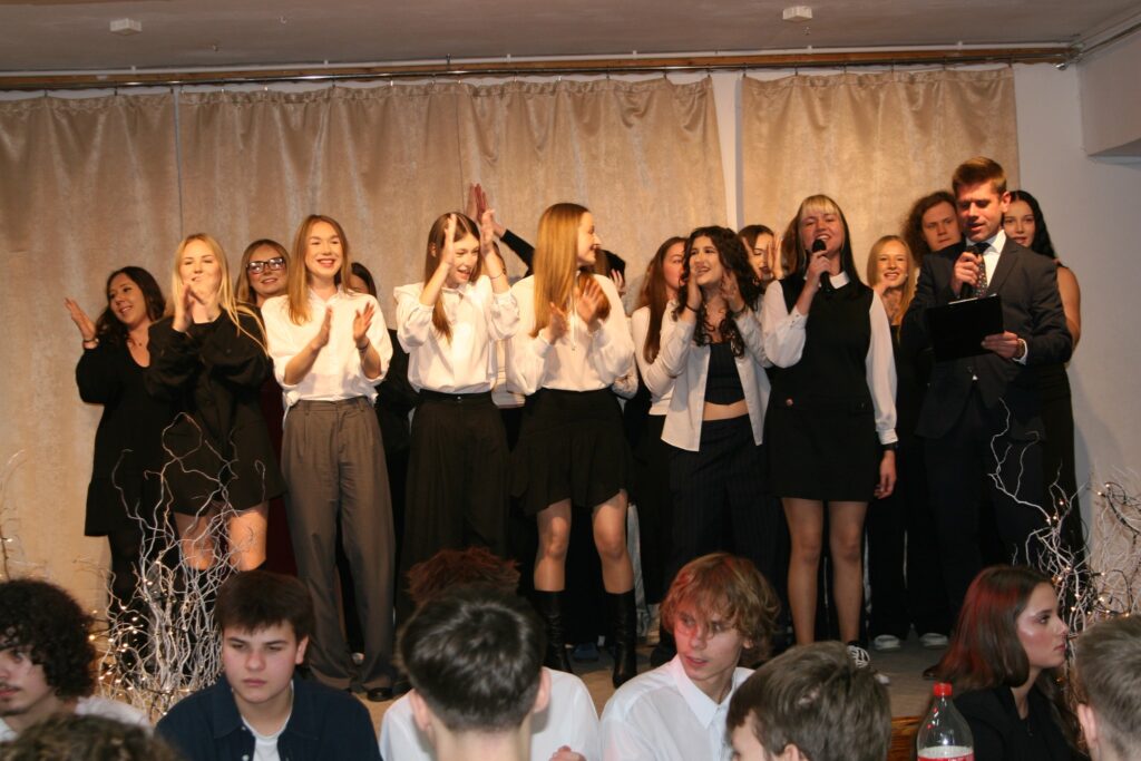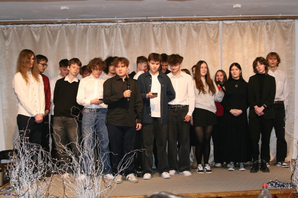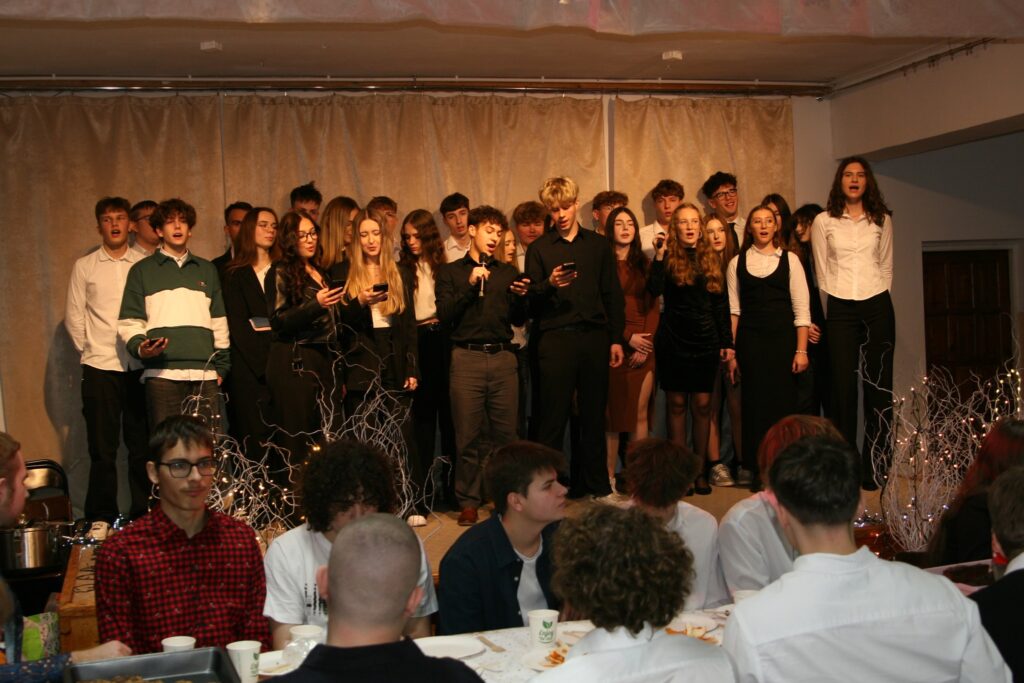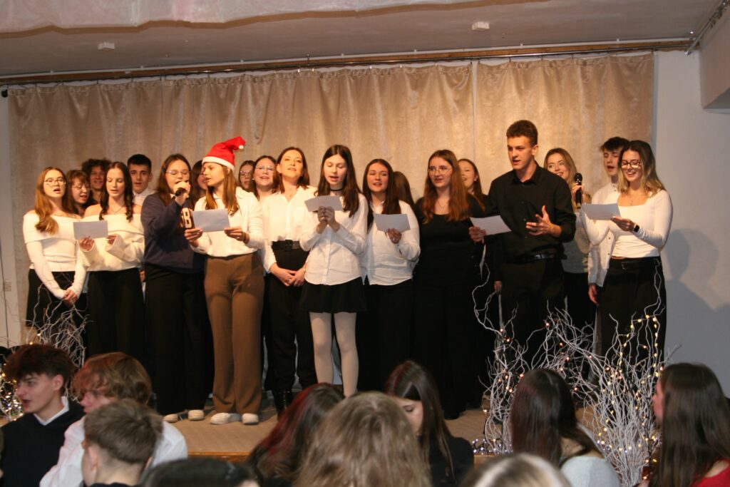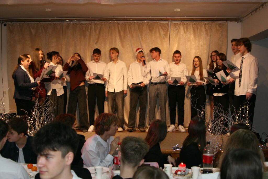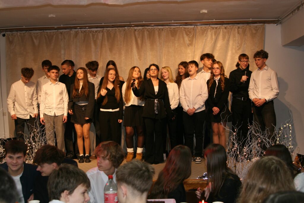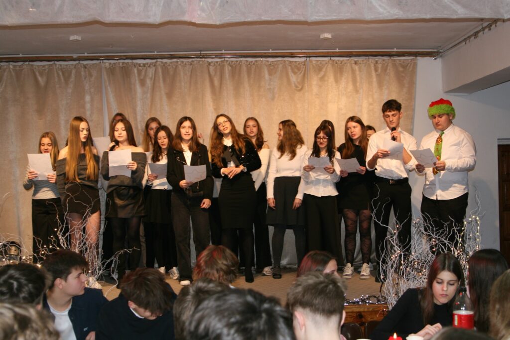 Po życzeniach wszyscy zasiedli do stołów. Kosztując wigilijnych przysmaków, słuchaliśmy barwnego wykonania kolęd- przez każdą klasę. Były to rzewne, sentymentalne wykonania lub nutki ożywiąjące i pobudzające do wspólnej zabawy. Oklaskom, przytupywaniu, a nawet podskokom- nie było końca. Niektóre klasy postarały się o specjalną choreografię i ciekawe stroje! Po tych wszystkich uniesieniach- na scenę weszli nauczyciele i pracownicy szkoły- a każdy ze swoją subtelną świeczuszką. Grono dorosłych odśpiewało kolędę „Uciekali”, a także zabisowało najbardziej chyba pobudzającą angielską wersją świątecznej piosenki. Młodzież znakomicie wtórowała i dołączyła się do podrygów.