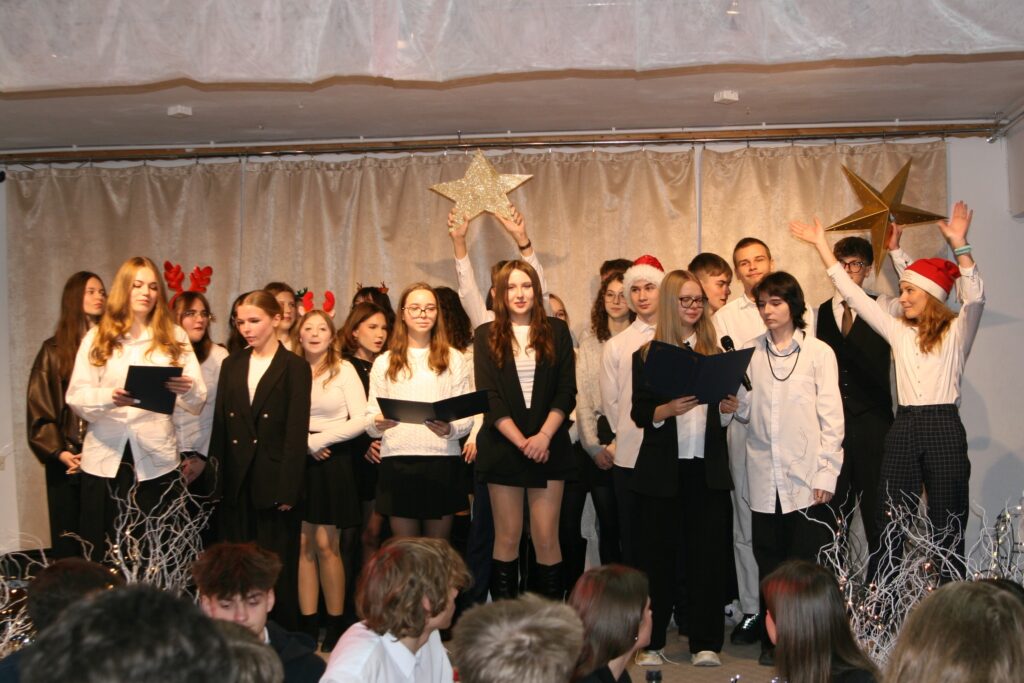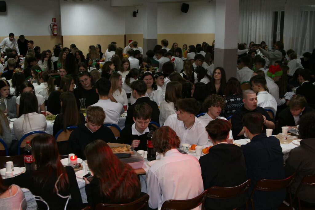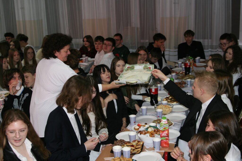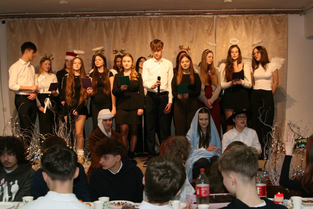 Jak co roku, wspólne świętowanie bożonarodzeniowe w naszej szkole odbyło się na auli, przy pięknie, klimatycznie przyozdobionych stołach- każda klasa postarała się, aby wyglądały naprawdę dostatnio. Pomimo największej w historii szkoły liczebności, daliśmy radę pomieścić się w ten wyjątkowy dzień w jednej sali. Bo ideą przewodnią takich spotkań jest dla nas zawsze jedność, serdeczność i nieposkromiona- radość!