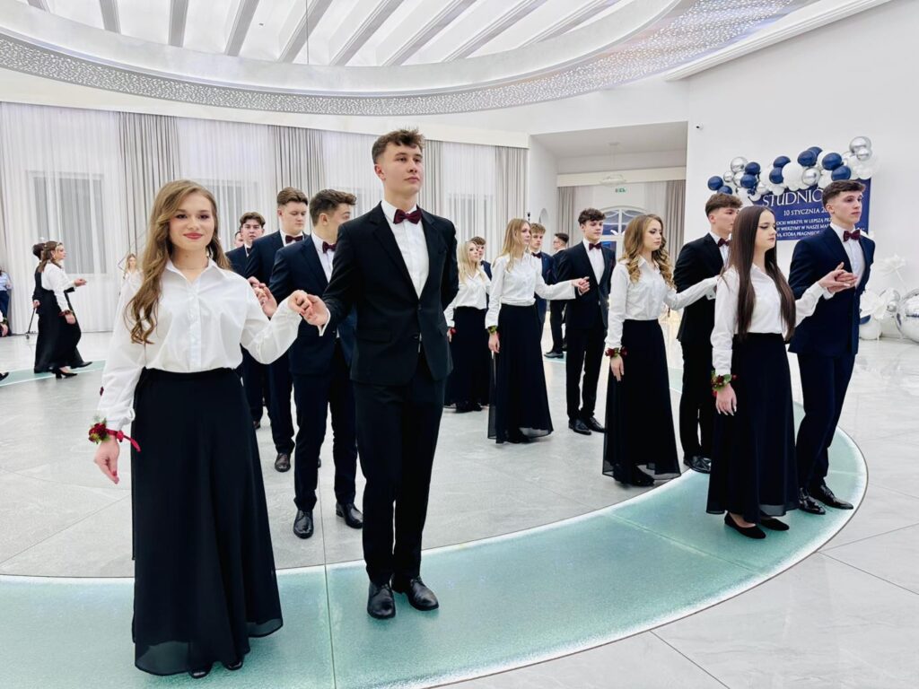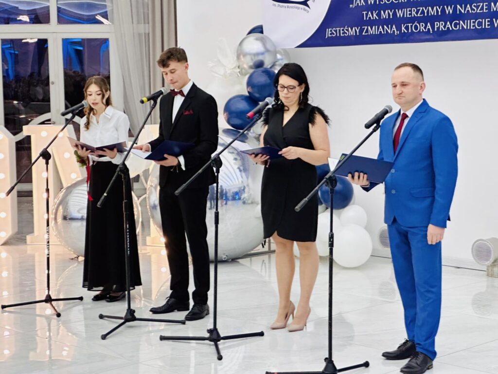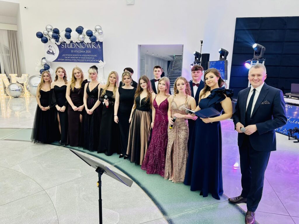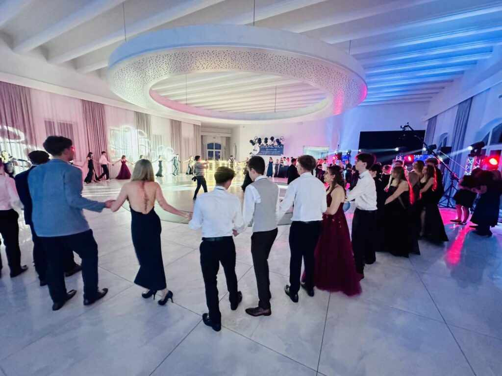Chwilę później parkiet opanowali bohaterowie wieczoru. Młodzież zaprezentowała aż trzy tury przepięknego poloneza, nagradzanego gromkimi brawami. Elegancja, skupienie i duma, jaka malowała się na twarzach uczniów, pokazały, jak ważny był to moment. Po tańcach przyszedł czas na życzenia i podziękowania pełne ciepłych słów, wdzięczności i emocji, które niejednej osobie zakręciły łzę w oku. Prawdziwą niespodzianką okazał się występ pani Dyrektor Ewy Karkowskiej i Wychowawców klas czwartych Zbigniewa Stępnia, Janusza Rejncharda i Hadriana Ślusarskiego, którzy po raz pierwszy w historii studniówki „Wysockiego” zaśpiewali specjalnie dla swoich uczniów. Sala wypełniła się owacjami, a młodzież jeszcze mocniej poczuła, jak wyjątkowa więź łączy ich z nauczycielami.