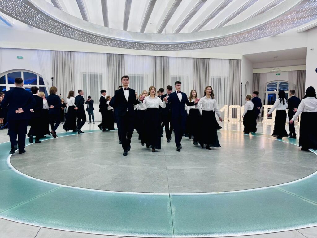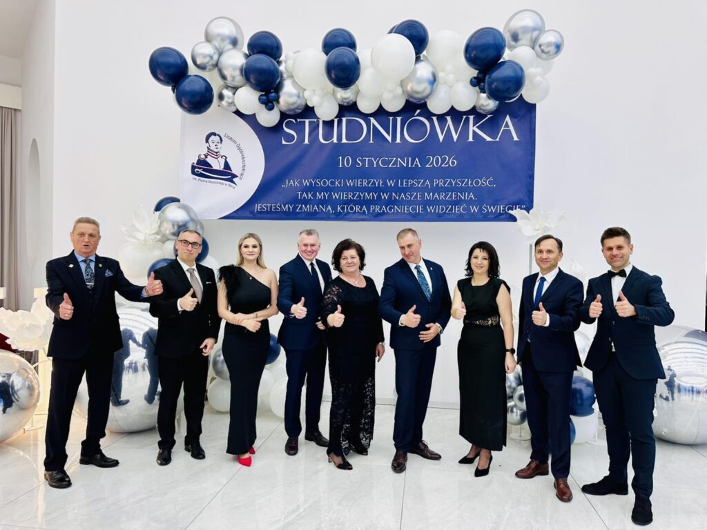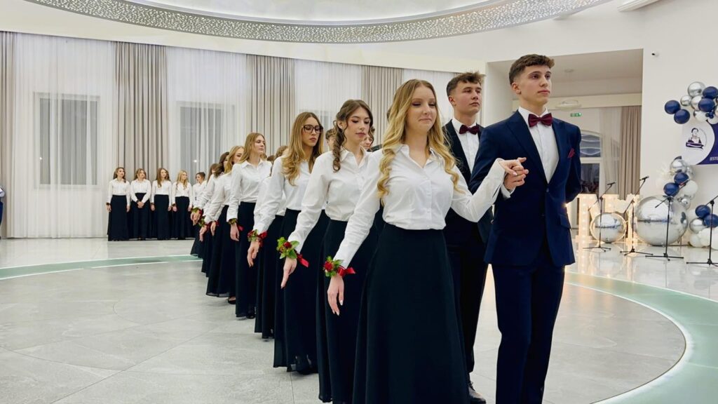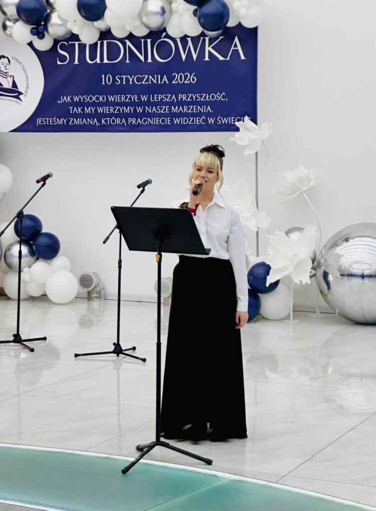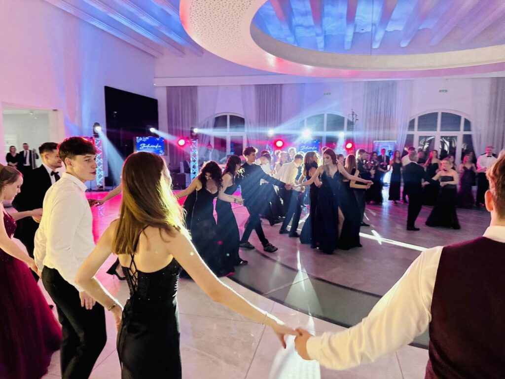 Chwilę później parkiet opanowali bohaterowie wieczoru. Młodzież zaprezentowała aż trzy tury przepięknego poloneza, nagradzanego gromkimi brawami. Elegancja, skupienie i duma, jaka malowała się na twarzach uczniów, pokazały, jak ważny był to moment. Po tańcach przyszedł czas na życzenia i podziękowania pełne ciepłych słów, wdzięczności i emocji, które niejednej osobie zakręciły łzę w oku. Prawdziwą niespodzianką okazał się występ pani Dyrektor Ewy Karkowskiej i Wychowawców klas czwartych Zbigniewa Stępnia, Janusza Rejncharda i Hadriana Ślusarskiego, którzy po raz pierwszy w historii studniówki „Wysockiego” zaśpiewali specjalnie dla swoich uczniów. Sala wypełniła się owacjami, a młodzież jeszcze mocniej poczuła, jak wyjątkowa więź łączy ich z nauczycielami.
