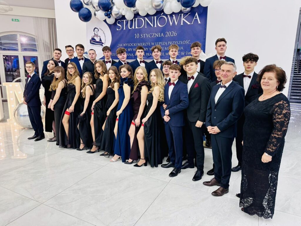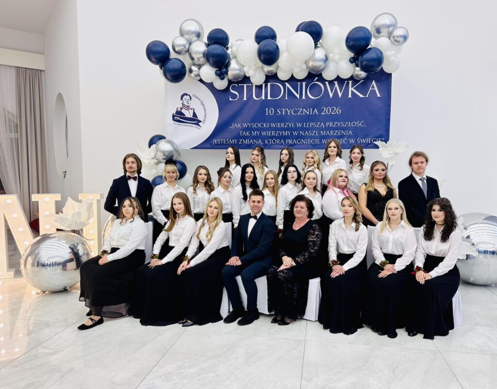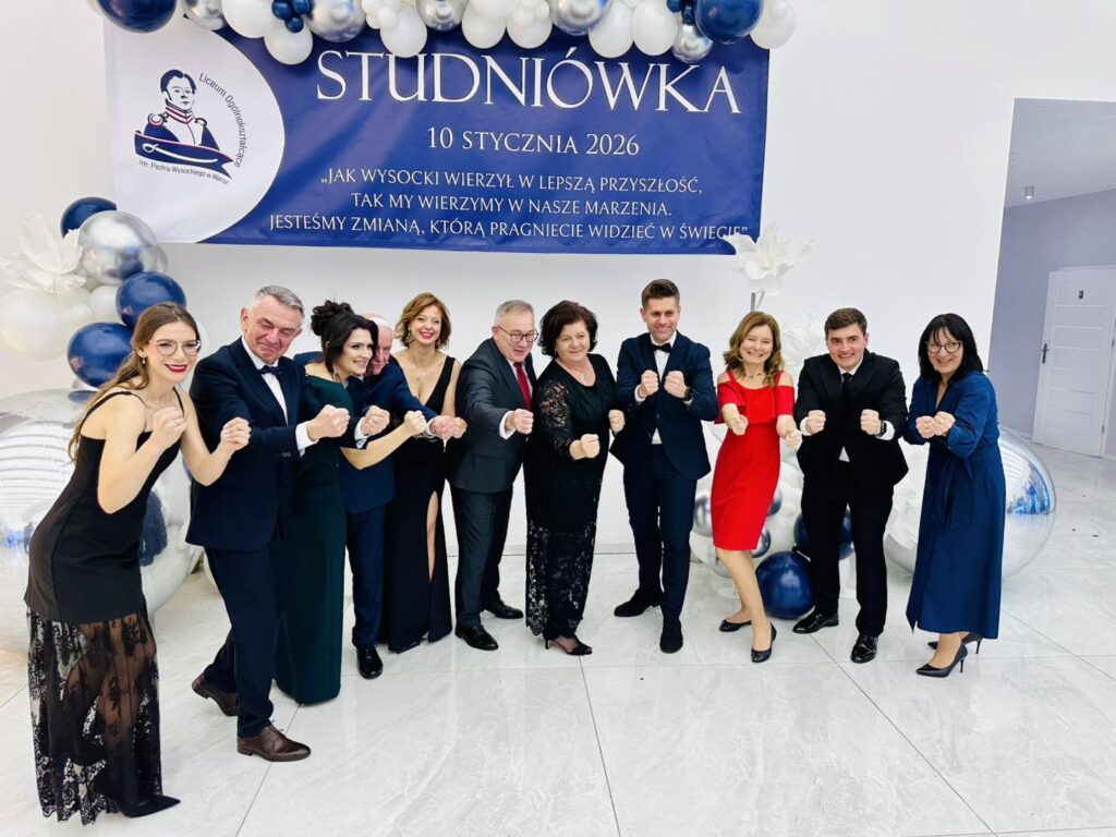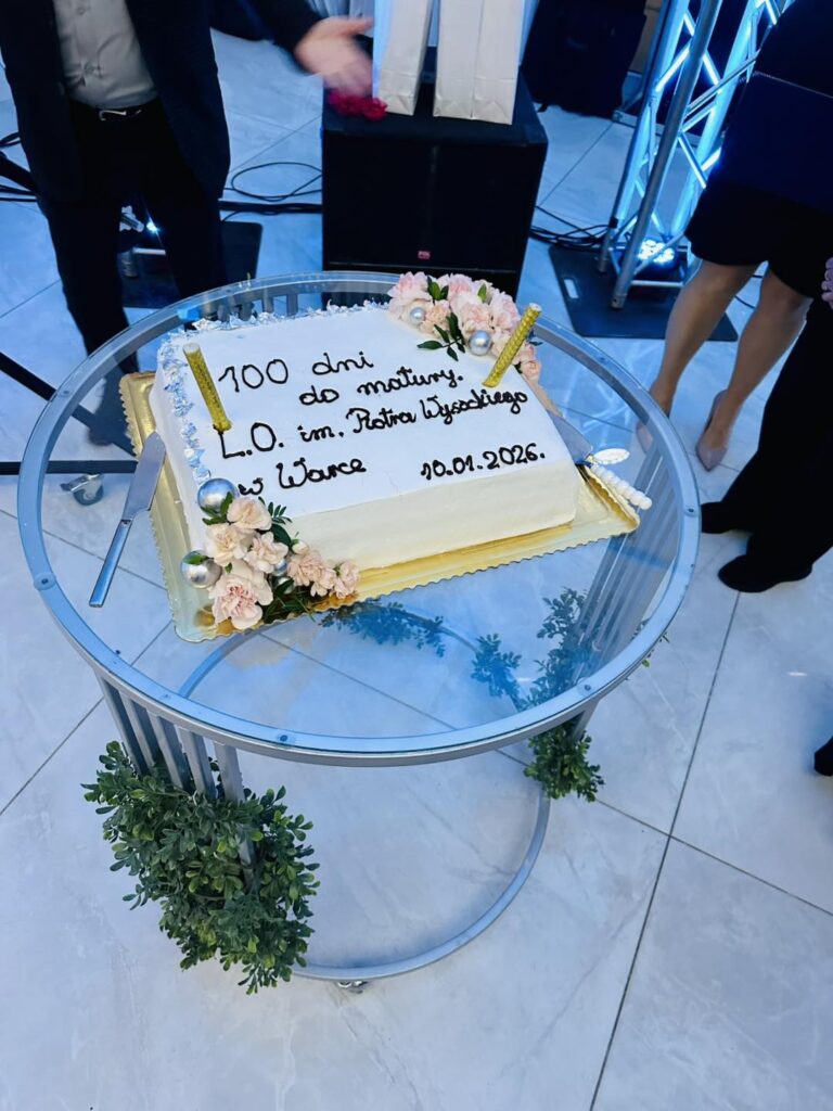 Jak przystało na liceum noszące imię Piotra Wysockiego, nie zabrakło również symbolicznego akcentu – patron szkoły dosłownie „ożył”, by zatańczyć poloneza z Panią Dyrektor. Ten moment wywołał zachwyt i uśmiechy, a wspólny polonez maturzystów z nauczycielami i zaproszonymi gośćmi stał się pięknym symbolem jedności całej szkolnej społeczności. Po wykwintnej kolacji i szalonej zabawie na parkiecie nadszedł czas na kolejny magiczny punkt programu. Na salę wjechał imponujący tort w blasku zimnych ogni, a przy nim zaprezentowano pokaz zdjęć podsumowujących cztery lata licealnych przygód. Wieczór studniówkowy urozmaicił też program artystyczny przygotowany przez uczniów, który dostarczył wszystkim mnóstwo radości. Szczególne atrakcje to quiz i jego kategorie pytań „ z czapki” i wiedzy o LO oraz wspólne wykonanie przez maturzystów i Dyrektora Gminnej Instytucji Kultury „Dworek na Długiej” pana Andrzeja Zaręby piosenki „Pokolenie” – znanej z repertuaru Kombi, które niosło mocny przekaz i nabrało wyjątkowego znaczenia. Śmiech, wspomnienia i wzruszenia mieszały się w jedno, tworząc atmosferę, której nie da się opisać jednym słowem. Zabawa przy stołach, tańce do białego rana i wspomnienia, które zostaną na zawsze – tak właśnie można podsumować studniówkę maturzystów Liceum im. Piotra Wysockiego w Warce. To był wieczór, który jeszcze długo będzie powracał w rozmowach i sercach jego uczestników.